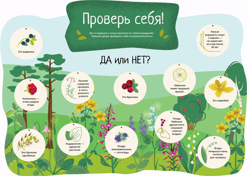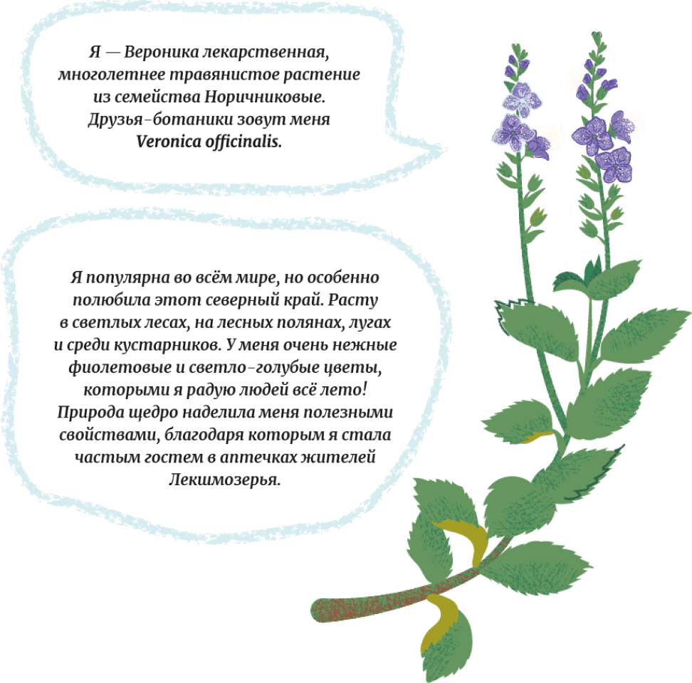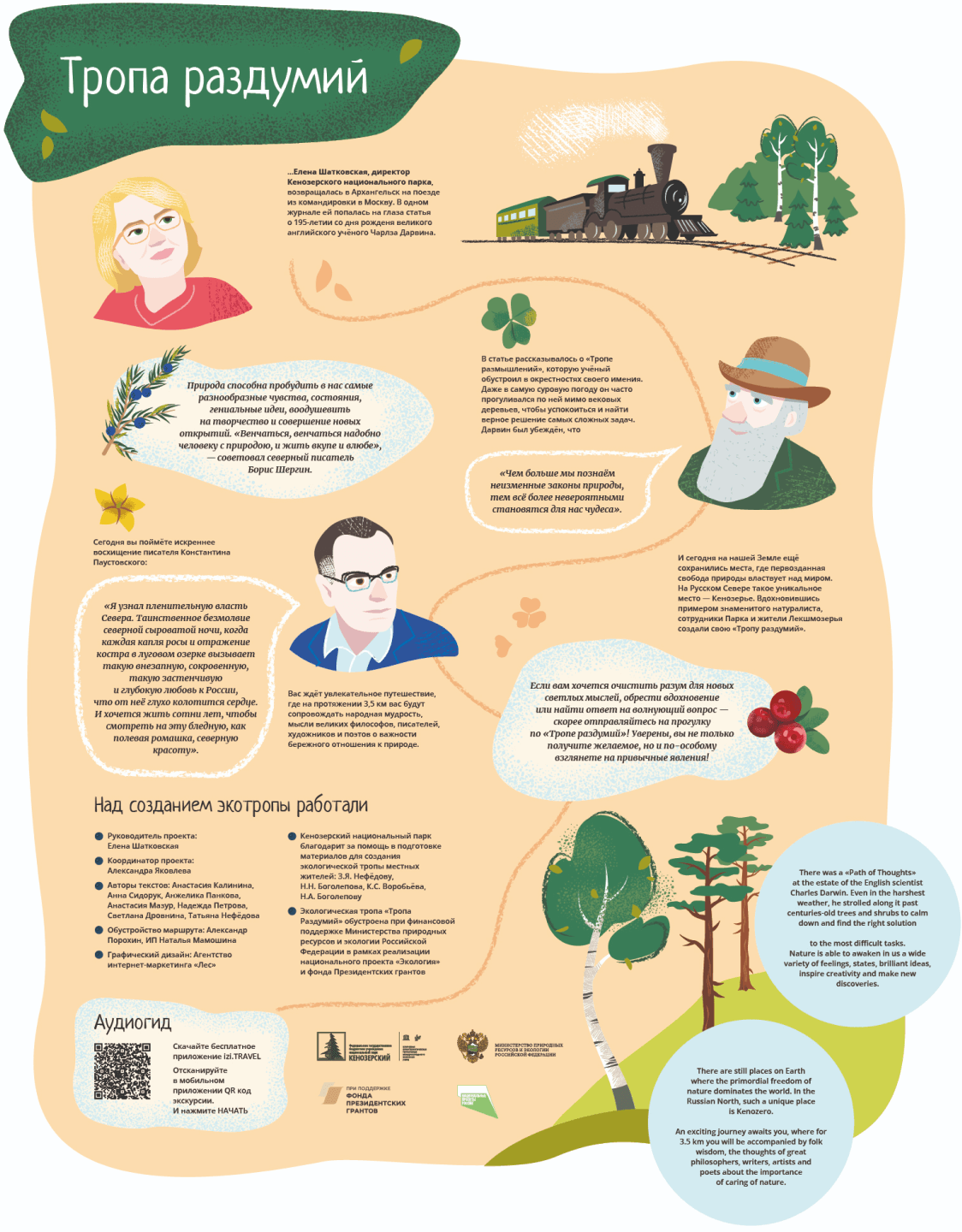 Каждый стенд на маршруте рассказывает об одном из 20 растений, которые встречаются на территории Кенозерья. На стендах — точные научные названия и занимательные факты, полезные свойства и все, что люди придумали делать из каждого растения. Главный приём повествования — рассказ от первого лица: берёза и шиповник, плаун и брусника, ландыш, зверобой и другие растения ведут прямой диалог с посетителем экотропы — простой, доступный и душевный.